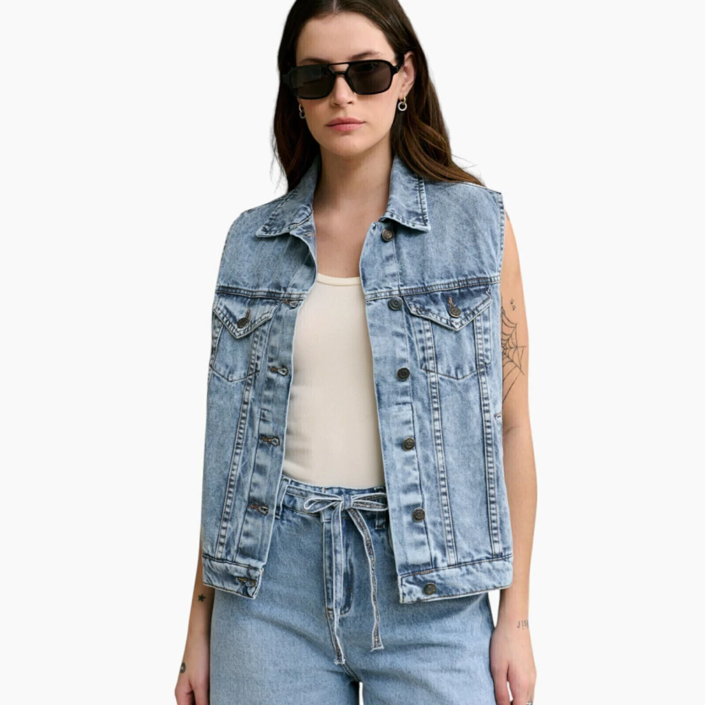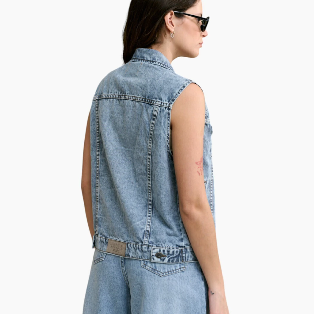 Chaleco de jean 100 % algodon. Avios en baño plata vieja, y etiqueta de marca color gris. Lavado celeste con leve localizado. Calce recto clasico, con bolsillos en los laterales.