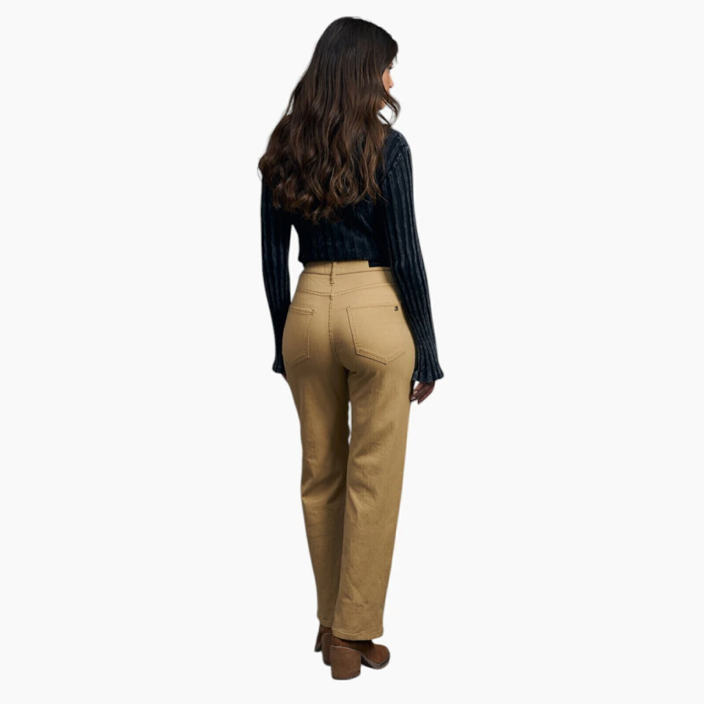 Pantalon tiro medio confeccionado en gabardina elastizada. Modelo de pierna recta desde cadera. Avios en baño cobre y badana en cintura. Cosido con hilo a tono.
