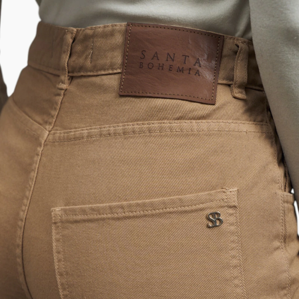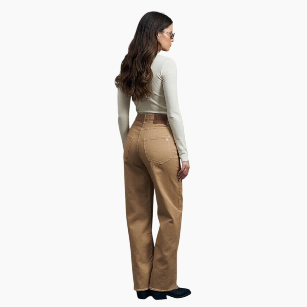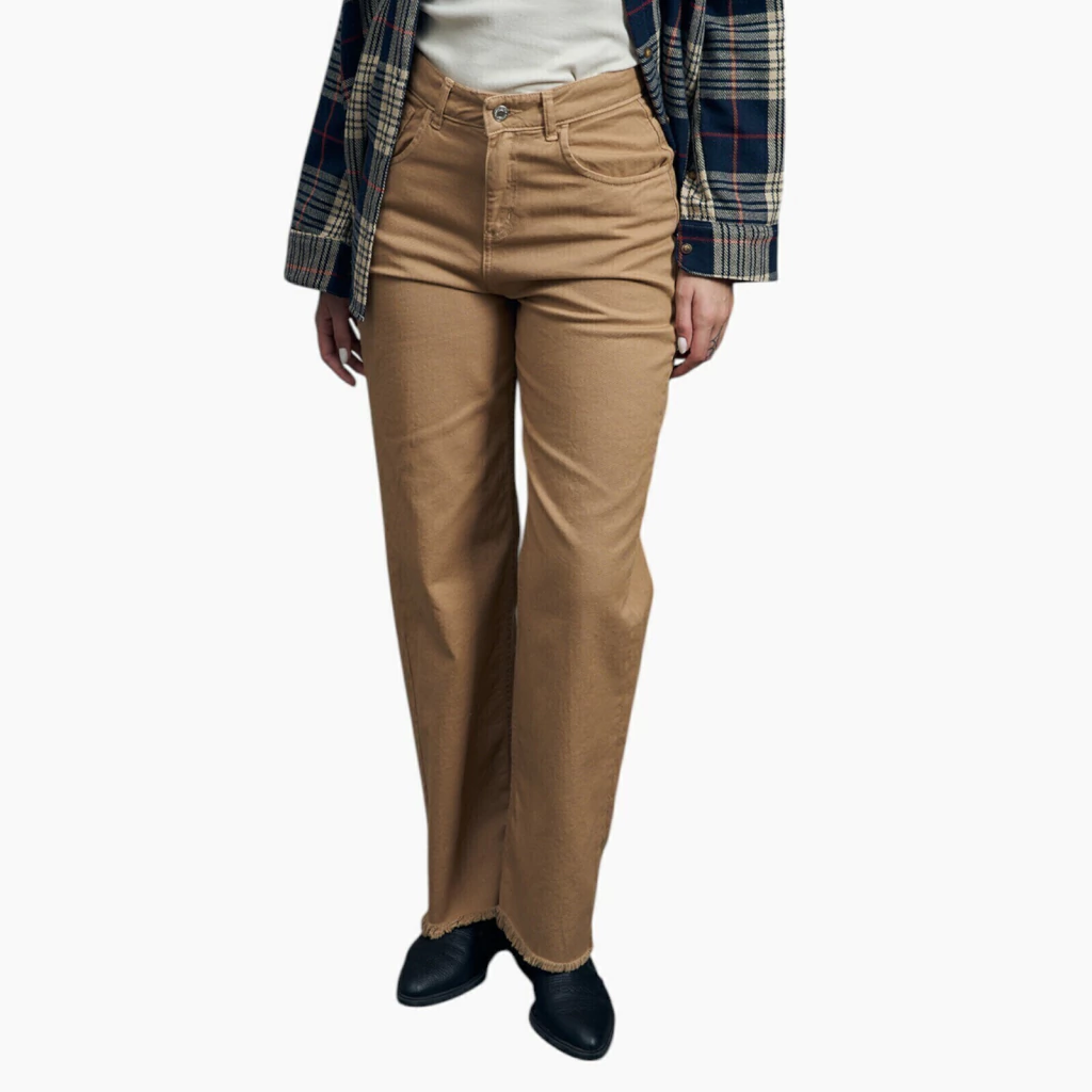 Jean Palazzo tiro alto en denim rigido 100% algodon. Boton y tachas en baño cobre, etiqueta de marca en cintura color camel. Ruedo al corte desflecado. Modelo de calce super cómodo, con pierna amplia a partir de la cadera, ideal para uso diario y outfits casuales.