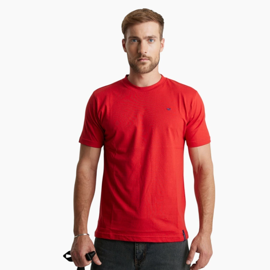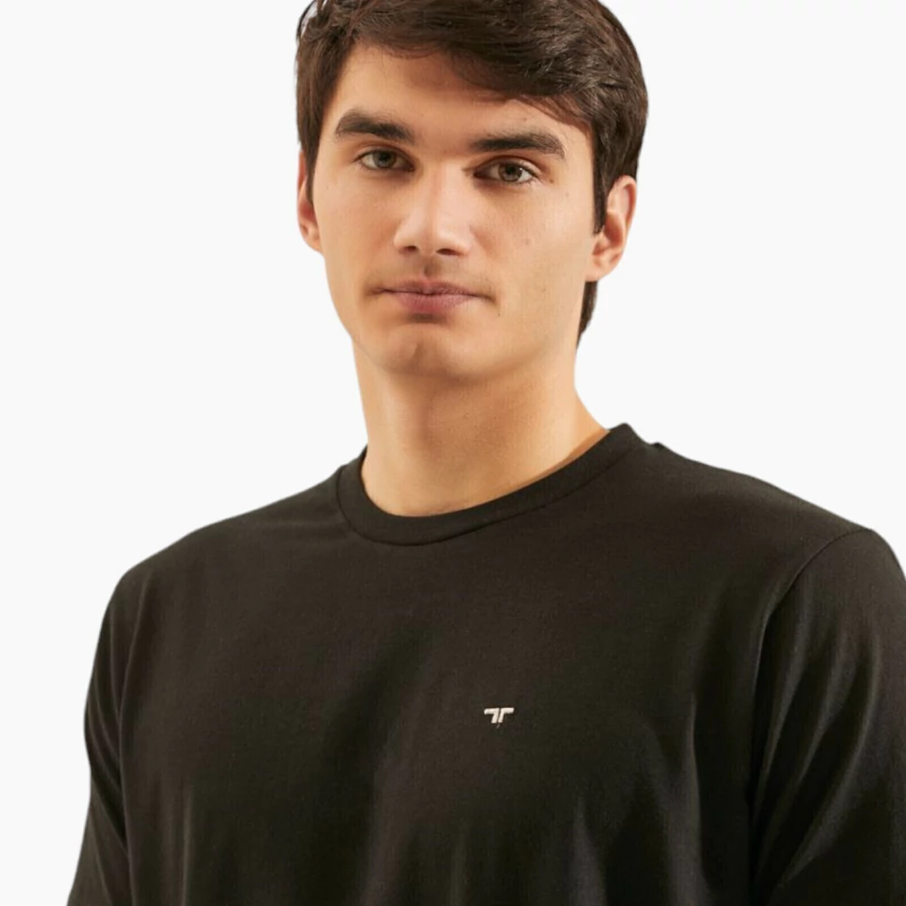 Calce regular, manga corta y escote redondo con cuello en tejido elastizado.