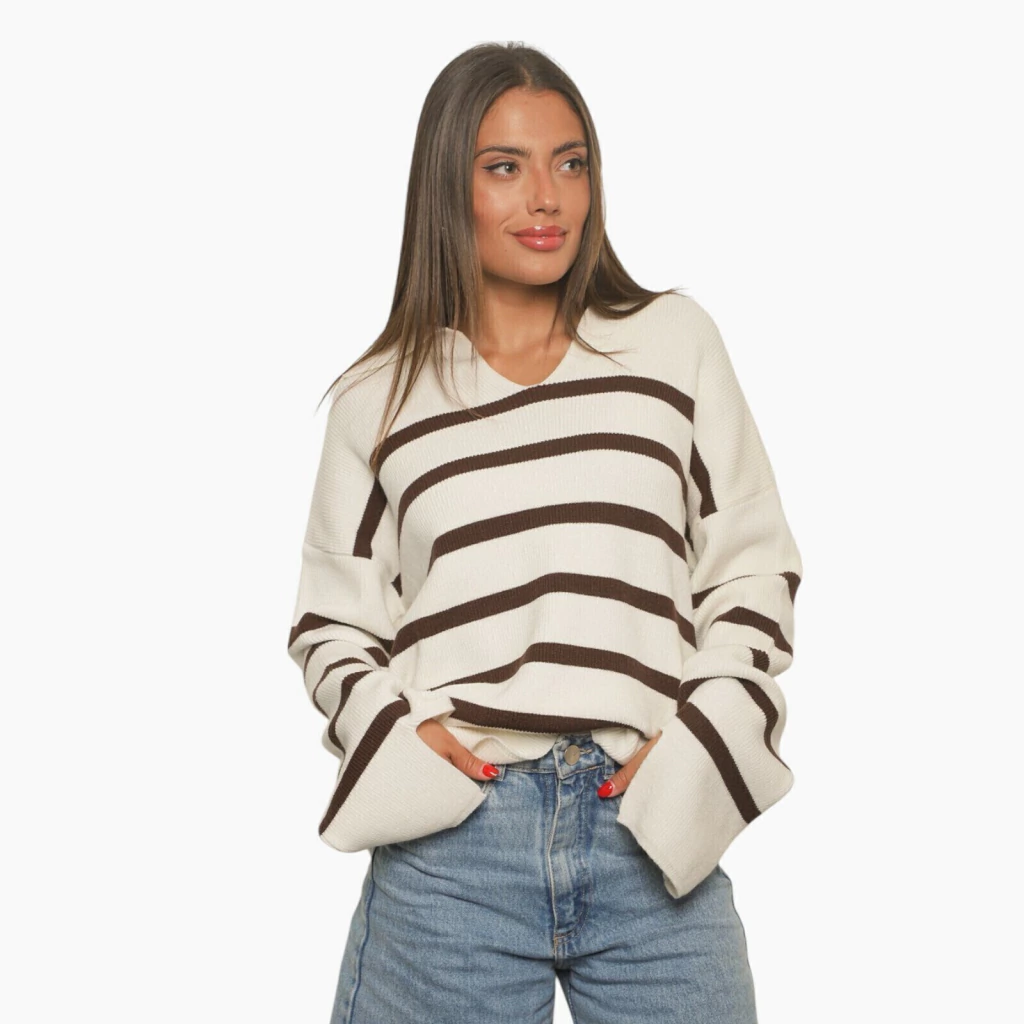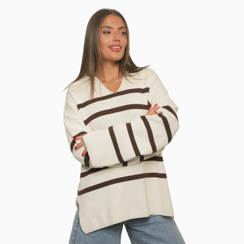 Descubrí el sweater ideal para sumar estilo y comodidad a tu look. Con cuello chomba y diseño rayado, corte amplio, este sweater combina un toque clásico con modernidad. Perfecto para cualquier ocasión informal o casual