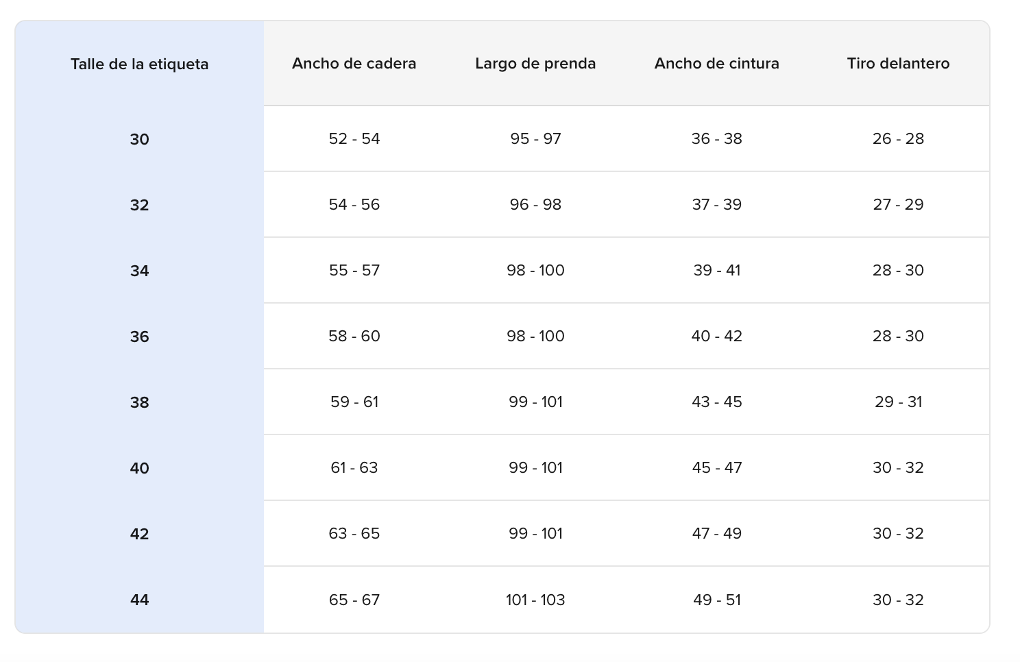 Guia de talles, medidas de prenda: